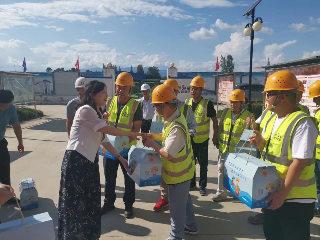 李晓媛主席将防暑礼品一一交到员工手中,与参建员工亲切交谈,感谢他们为建设项目所做出的贡献并仔细询问了大家的工作情况和身体状况,对大家在炎炎夏日中坚守岗位的工作态度和精神风貌表示赞赏,随后嘱托大家要注意安全建设和防暑降温,保重身体。